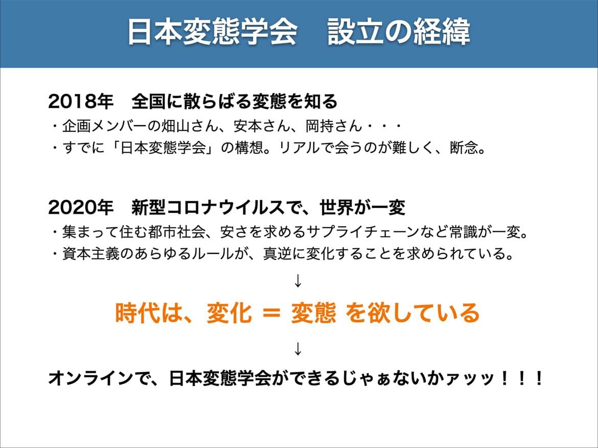 記念すべき第一回日本変態学会の開催。新型コロナウイルスの感染が拡大し、第一回の緊急事態宣言が発動され、子供たちの学校は休校、飲食店などは自主休業を余儀なくされた、そんな頃でした。しかしいつまでも自粛をしてはいられない。新しい生活様式に変える流れになり、私たちもどう変わる=変態するのか。企画者の4人が語りました。