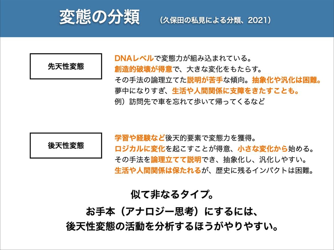 今回の話題提供者は、日本有数の変態である安本勝博さん(行政の作業療法士)と久保田好正(株 式会社斬新社代表、作業療法士)。変態的視点とできることから始める実践のご紹介します。
